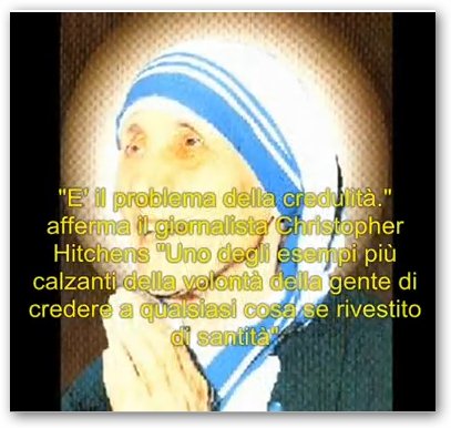 Ho letto ieri l’articolo di Illiric89 il quale Sicuramente è in buona fede quando afferma che “Madre Teresa ha dedicato tutta la sua vita all’India e lo ha fatto per aiutare le popolazioni indiane … “ ma la verità, su questa persona che il Vaticano ha fatto santa, è molto diversa da ciò che ci viene propinato quotidianamente con la dottrina dei media. Linda Polman giornalista olandese, nel suo libro inchiesta L’industria della solidarietà, denuncia molte Ong cattoliche che usano il ricatto religioso: cibo in cambio di abiura di proprie convinzioni e conversione. Fra questi “aiuti umanitari” spicca il caso della cosiddetta Madre Teresa di Calcutta. Scrive la Polman: “Ero a Calcutta quando era ancora viva e gestiva un ospedale. Circondato da mura altissime, era il terrore per i bambini che si sentivano dire: guarda che se non stai buono viene Madre Teresa e ti porta via. Di fatto, denuncia la giornalista, varcate quelle mura la gente moriva senza cure mediche e medicine. ( …) I finanziamenti che riceveva in cifre ingenti non li spendeva per l’ospedale ma li accumulava sul proprio conto”. Oltre alla Polman altri giornalisti hanno denunciato questa ennesima bufala vaticana: Cristopher Hitchens, La posizione della missionaria; Alan Drew Nel giardino d’acqua. Sui pochi giornali italiani che denunciarono questa tragedia umana, tra i quali spicca la rivista left, è scesa una cappa di silenzio cha assomigliava molto ad una pulsione di annullamento.